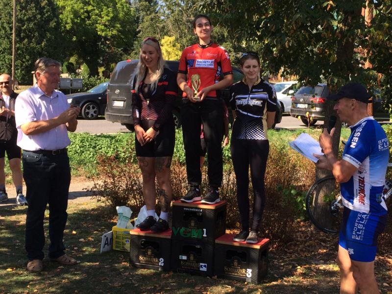 Bei schönstem Spätsommerwetter ging Bianca von den Dreien als erste an den Start. Tage zuvor hatte sie noch ein paar Tage in Tirol verbracht um sich auch beim täglichen Radeln auf das Event vorzubereiten. Vom Start weg wurde bei den Damen flott gefahren und das Spitzenfeld wurde kleiner. Bianca konnte jederzeit mitfahren und hat dann am Ende bzw. letzten Anstieg ihre gute Form voll ausnutzen können. Keine der Starterinnen konnte mehr folgen und somit gewann sie nicht nur ihre Altersklasse (vor Lisa Juhra aus Dresden und Katja Liebscher von der RSG Torpedo Lärchental) sondern auch das Rennen der Frauen insgesamt!